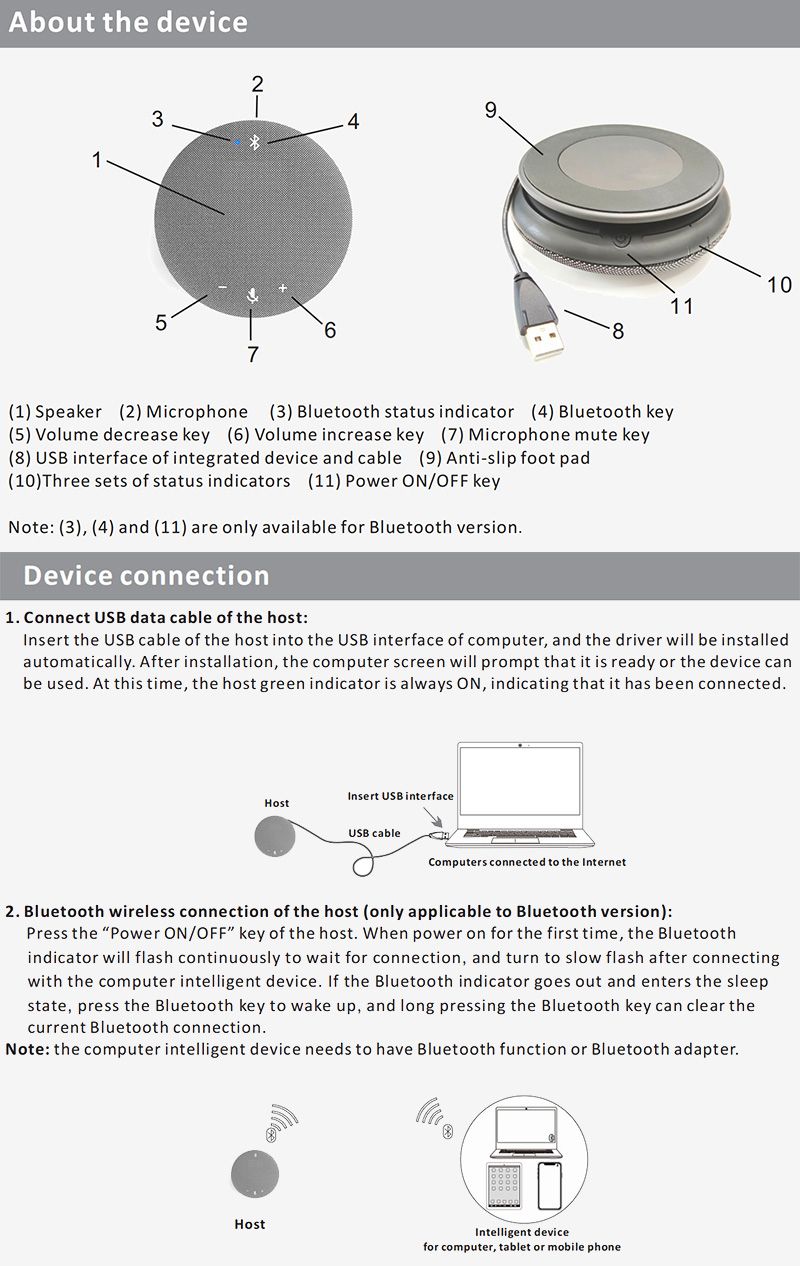 - Functional features:BT-31S Bluetooth omnidirectional microphone is a portable conference microphone, connected via USB, Bluetooth Bluetooth adapter, can be quickly paired with Bluetooth-enabled devices, can be held anytime, anywhere. It is suitable for small medium-sized meetings, can also be used normally in high-end family business or leisure entertainment places.