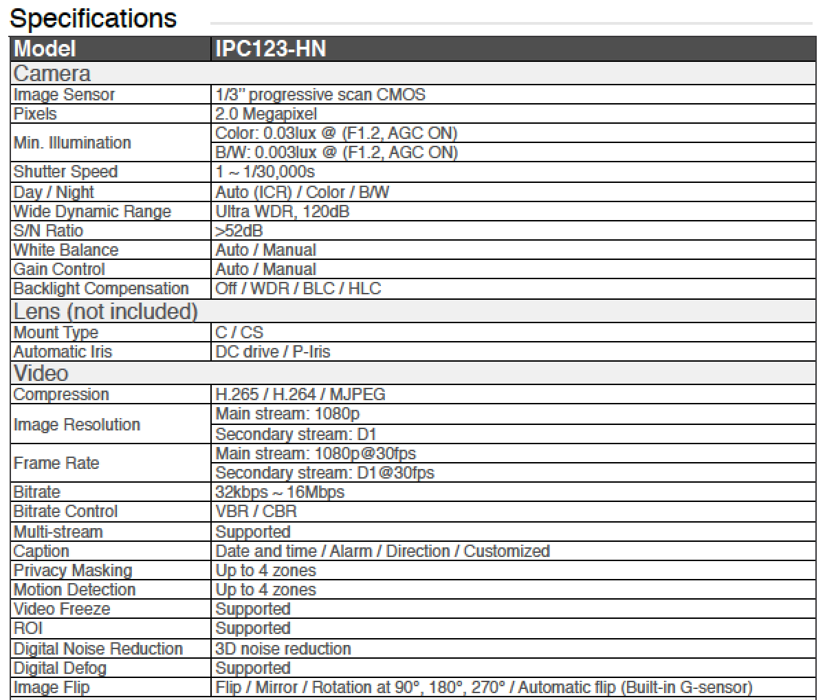 Network Box Camera 2.0M Ultra WDR, model: IPC123-HN
